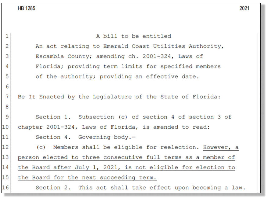 Andrade’s bill states that anyone elected to the ECUA board for three consecutive terms would not be eligible to run for the next succeeding term.