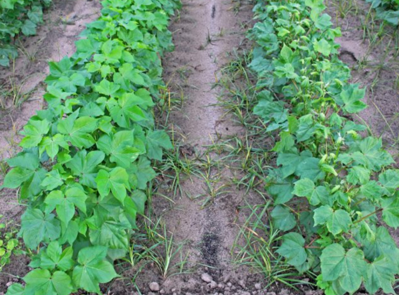 Pictured: Traditional cotton with dicamba drift injury row (right) vs healthy (left). Photo by Jay Ferrell, UF/IFAS, for NorthEscambia.com, click to enlarge.