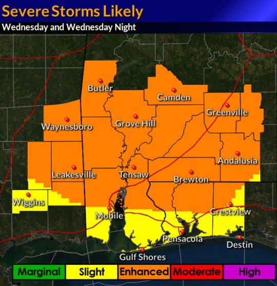 There is an enhanced risk (level 3 of 5 of severe storms for Wednesday afternoon and Wednesday night in most of the North Escambia area. the potential threats include strong tornadoes, damaging winds in excess of 60 mph and large hail up to golf ball size. Additional updates will be provided by the National Weather Services as they refine the forecast: