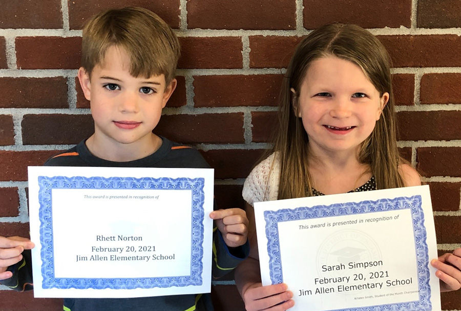 Jim Allen Elementary School has named their February Students of the Month. They are Rhett Norton (pictured left) and Sarah Simpson. Photo for NorthEscambia.com, click to enlarge.