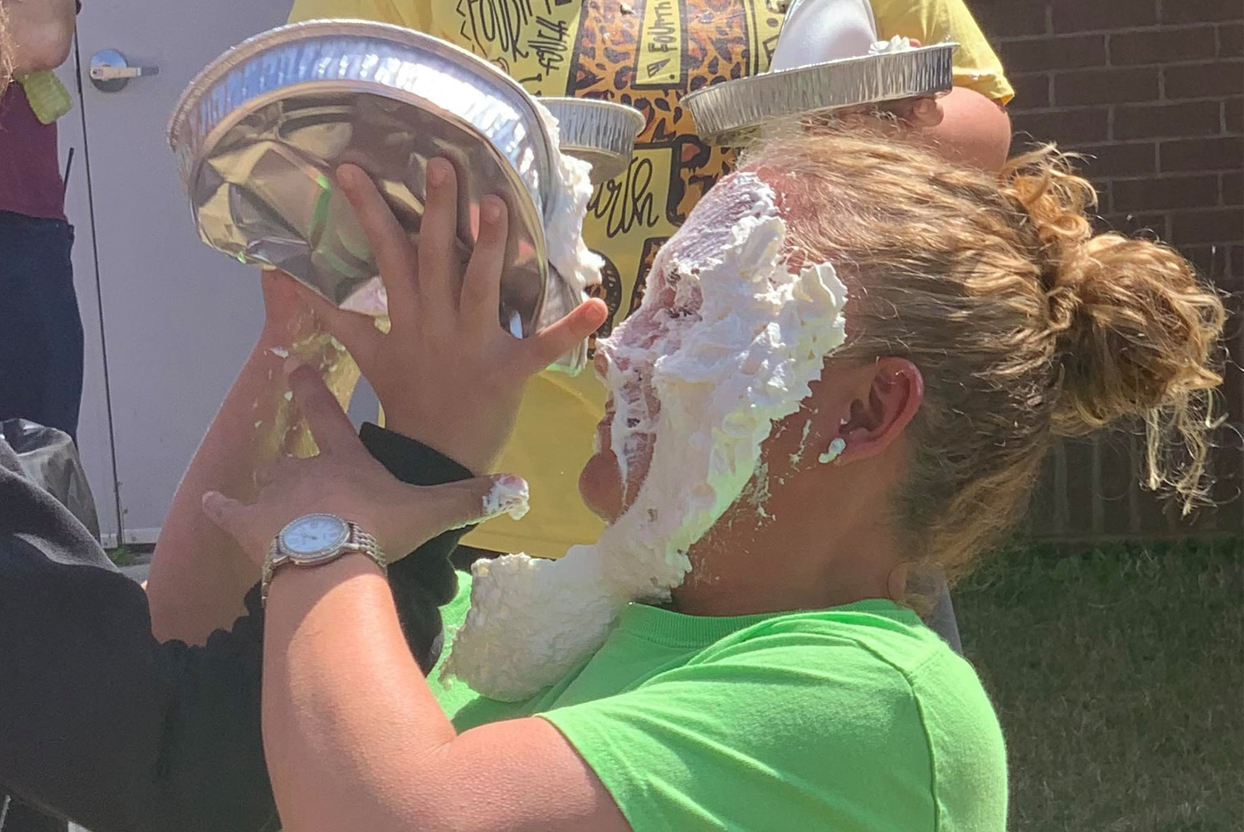 “We took nominations for teachers who wanted to be pied. Throughout the week students brought in money to add to the jars for the teacher they wanted pied,” said Kenli Rowe, a fundraising project coordinator and proud recipient of a pie plate full of whipped cream.