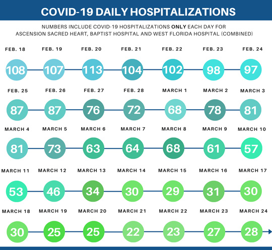 The numbers in the graph indicate daily hospitalizations in Escambia County and are provided daily by Ascension Sacred Heart Hospital, Baptist Hospital and West Florida Hospital. The daily numbers are not cumulative.