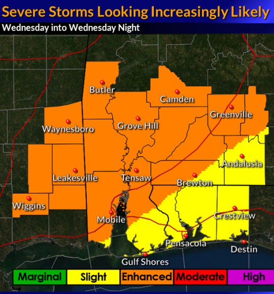 Wednesday Night: Showers and thunderstorms. Some of the storms could be severe. Low around 61. South wind around 15 mph, with gusts as high as 25 mph. Chance of precipitation is 90%.