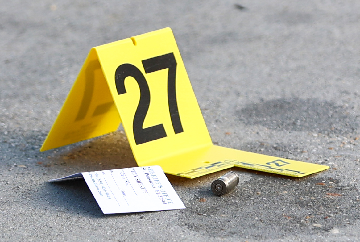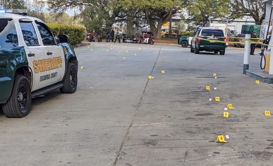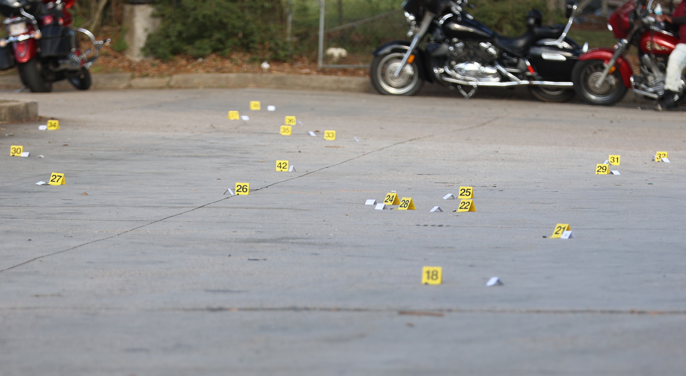 Dozens of shell casings were scattered across the parking lot of the Circle K on Nine Mile Road at I-10. Evidence markers numbered into the 40s marked shell casings and other evidence across about 175 feet of the parking lot. Most of the markers were next to shell casings, while others marked two $1 bills and a credit card. At least three motorcycles were reported to be damaged.