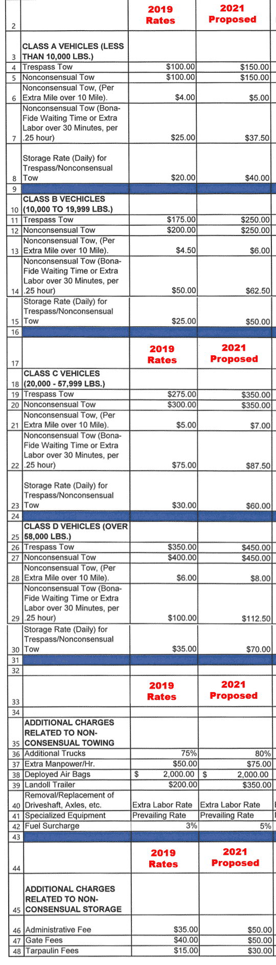 For vehicles less than 10,000 pounds, the maximum towing fee will increase from $100 to $150, and daily storage will increase from $20 to $40.