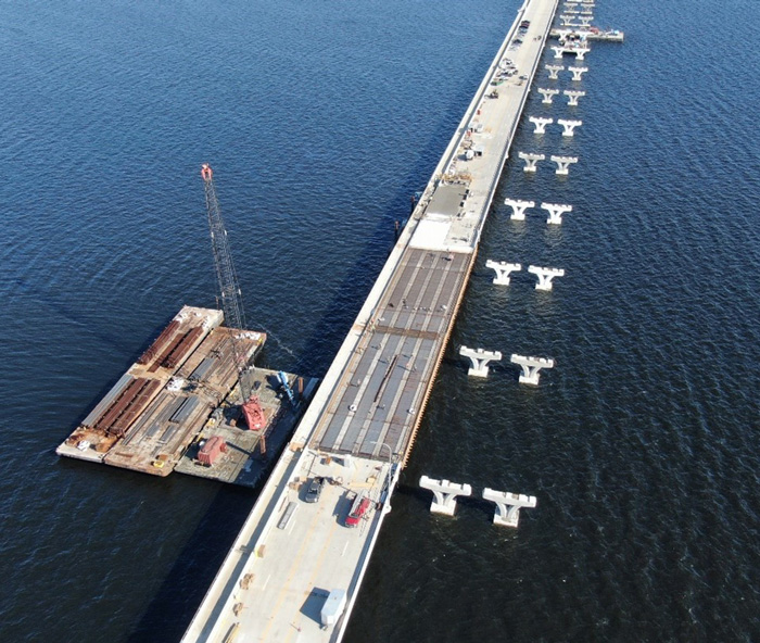FDOT contractors have completed the installation of multiple stay-in-place forms and are currently pouring and leveling concrete on the bridge. Following the completion of the concrete pours on the bridge deck, crews will construct barrier walls designed to create a reinforced, protective wall for motorists traveling over the bridge. Additional work will include the installation of electrical conduit and roadway striping.