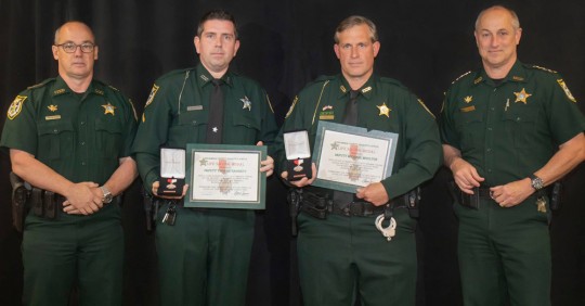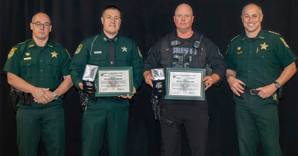 The Medal of Courage was presented to Master Deputy Matt Watkins, Deputy Trenton Hershberger, and Deputy Daniel Weller, who were engaged in a lengthy exchange of gunfire with a violent suspect who was wanted for aggravated assault and battery on a law enforcement officer. Watkins, Hershberger, and Weller showed extreme bravery in the face of danger by staying in the gunfight and assisting with apprehending the armed and dangerous suspect.