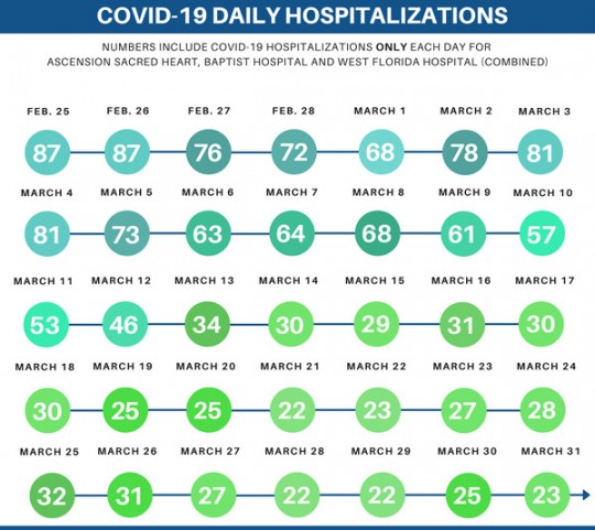 The numbers in the graph indicate daily hospitalizations in Escambia County and are provided daily by Ascension Sacred Heart Hospital, Baptist Hospital and West Florida Hospital. The daily numbers are not cumulative.