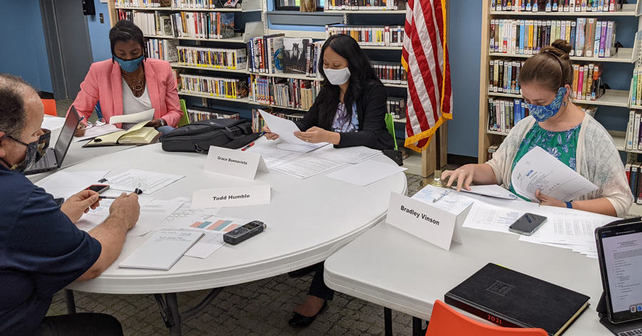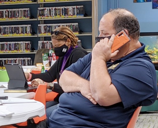 Pictured top: West Florida Public Libraries Director Todd Humble (far left), and Board of Governance members (L-R) Robin Reshard, Grace Buenatista, and Bradley Vinson during a meeting Monday afternoon at the Century Branch Library. Pictured inset: Humble, with board member Dr. Laura Bryant in the background. Pictured below: Reshard and Bryant remained the Century Branch Library parking lot at 6:33 p.m. NorthEscambia.com photos, click to enlarge.