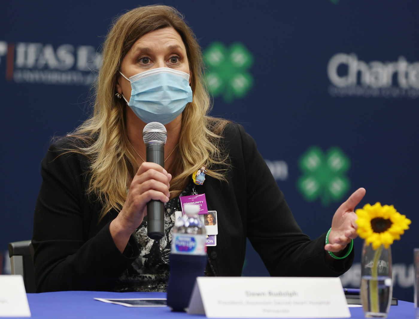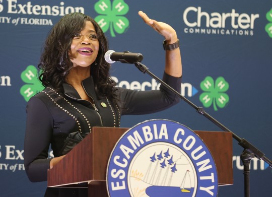 Pictured: Participants in “A Real Rural Tech Talk” about broadband internet access Friday in Cantonment included Florida Chief Financial Officer Jimmy Patronis (top), Escambia County District 5 Commissioner Steven Barry (top inset) Director of Workforce Education for the Escambia County School District Steve Harrell (middle inset), North Escambia agricultural producer Scott Walker (bottom inset), Senior Vice President of State Government Affairs Charter Communications Marva Johnson (below), President Ascension Sacred Heart Hospital Pensacola Dawn Rudolph (second below), and 4-H Escambia Council Treasurer Jessica Conti (third below). NorthEscambia.com photos, click to enlarge.