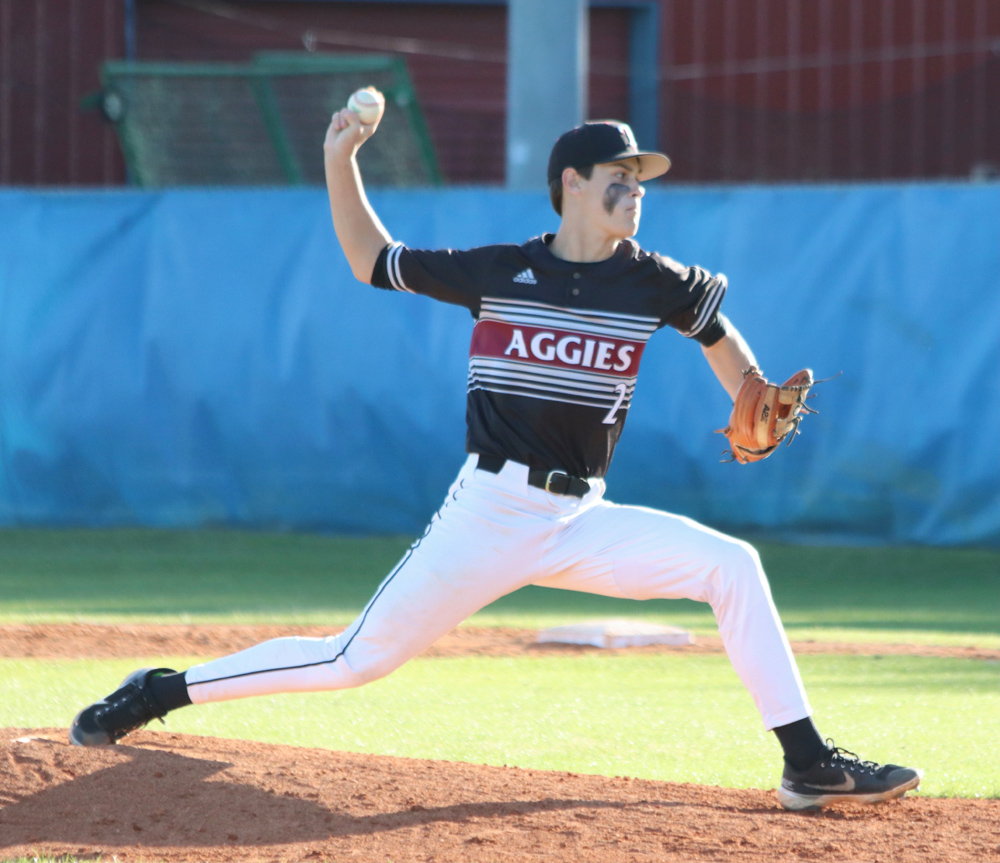 Josiah Glodfelter started on the mound for Aggies, going four and a third innings, allowing six runs on four hits and striking out seven.