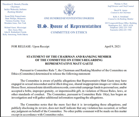 “The Committee is aware of public allegations that Representative Matt Gaetz may have engaged in sexual misconduct and/or illicit drug use, shared inappropriate images or videos on the House floor, misused state identification records, converted campaign funds to personal use, and/or accepted a bribe, improper gratuity, or impermissible gift, in violation of House Rules, laws, or other standards of conduct. The Committee, pursuant to Committee Rule 18(a), has begun an investigation and will gather additional information regarding the allegations.