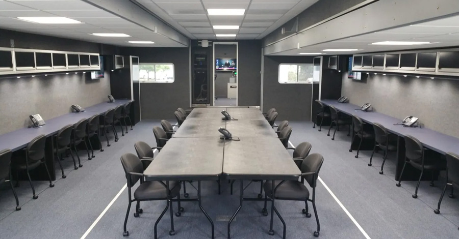 It allows for wireless communications, including cellular, satellite, VOIP phones and radio equipment. It has a 52-foot mast with antennas an high resolutions cameras, a video distribution system for off-air television, satellite television and computer system. There is a four-position communication room and office space with printers, scanners, office supplies, mini-fridge, microwave and a coffee maker.