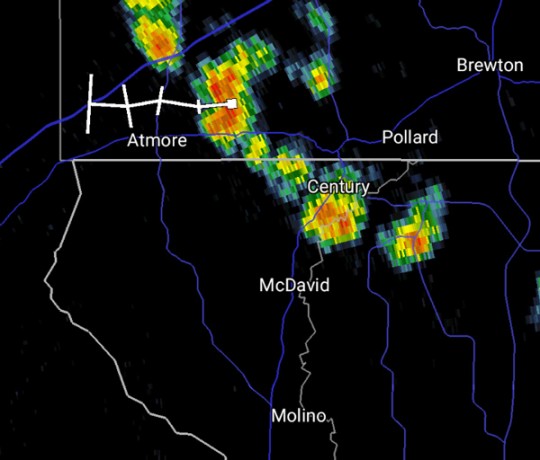Pictured: The beauty of a North Escambia thunderstorm just before 7 p.m. Saturday as seen from various points along Highway 29 from Molino (bottom photo) to McDavid (above). A radar image showing the location of the storm is below. NorthEscambia.com photos, click to enlarge.