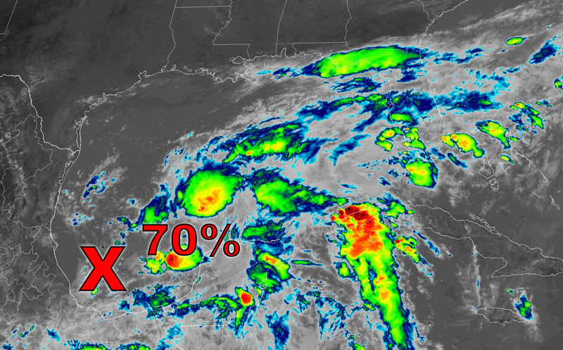 A tropical disturbance over the Bay of Campeche in the far southern Gulf of Mexico this morning is expected to gradually become better organized by the end of this week and lift north across the western Gulf of Mexico. A tropical depression is likely to form late Thursday or Friday. This tropical disturbance currently has a 70% chance of becoming a tropical depression.