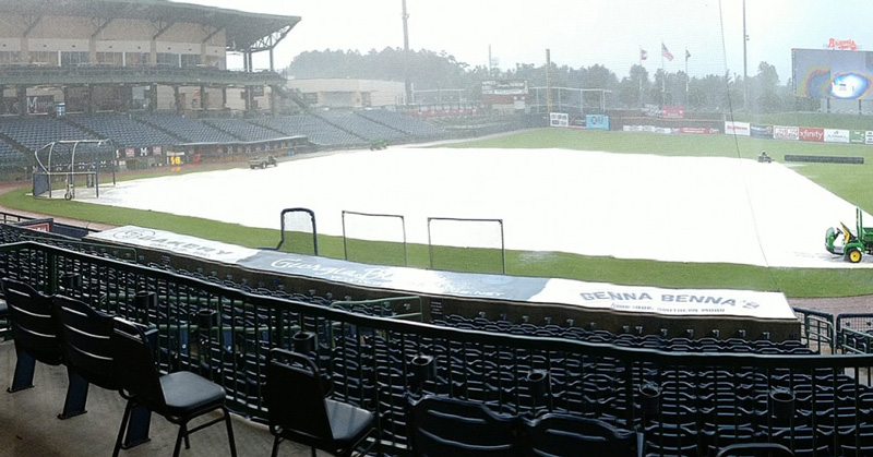 Mississippi’s grounds crew and front office did all they could; but despite their best efforts, they were unable to pull the tarp over home plate and the dirt near first base. Once it became clear that the tarp was too heavy to move, it was obvious that baseball was done for the day.