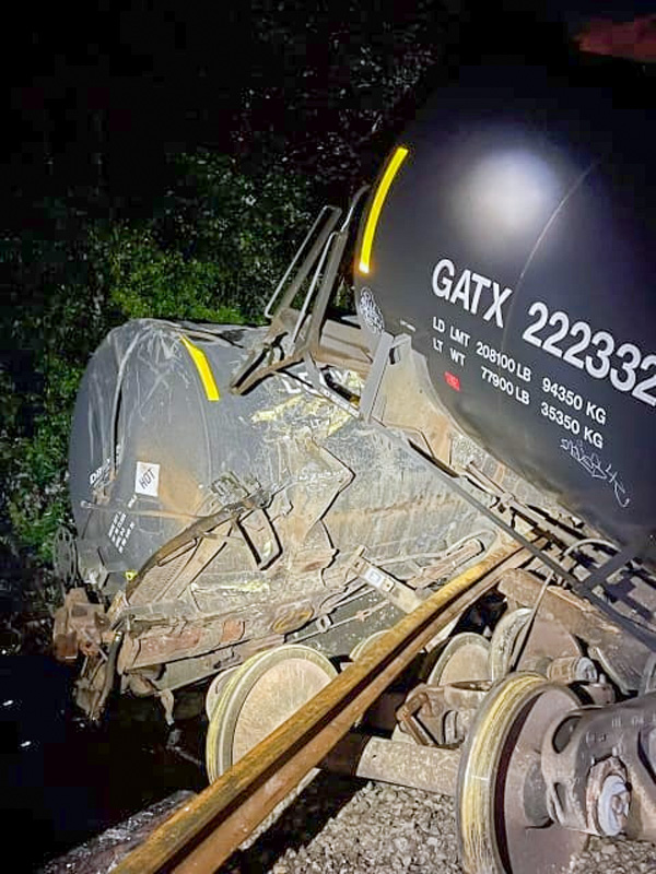 Twenty-five cars of a southbound CSX train derailed in a heavily wooded area a mile north of the West Fraser Sawmill about 10:35 p.m. the night of July 19. Several tanker and hopper cars were among those scattered about the tracks during the derailment.