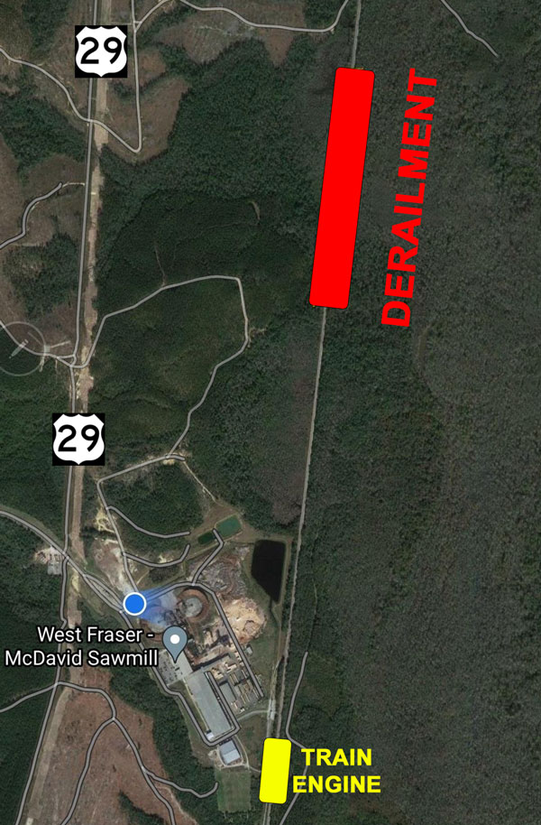 The train engine came to a stop behind the sawmill, but due to the remote area of the site with no nearby roads, it took first responders about 45 minutes to locate and reach the area of derailment using a UTV and four-wheel drive vehicles on dirt hunting camp roads.