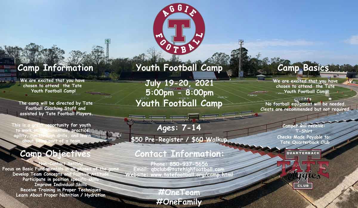 Registration is open now for the 2021 Tate Youth Football Camp, which will be held July 19-20 from 5-8 p.m.