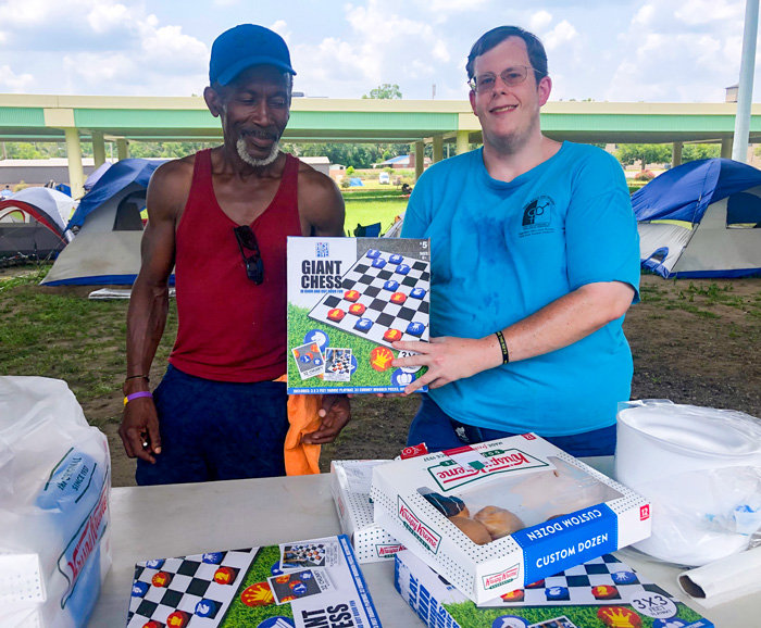 He supplied the pizza, doughnuts and water. And he gave away about 20 chess boards to those who wanted to play in the future.