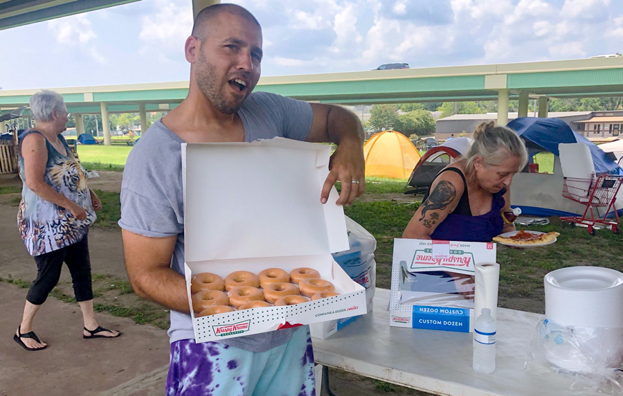 Lopez was met by a large group of men and women that call the tent city home. It was hot, almost noon, when Lopez arrived.