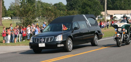 Outside the main gate of Pensacola NAS, people gathered to pay their respects to the young soldier. The rain did not send them running; they stood silently — many holding American flags — as the hearse carrying an American hero departed on a 55-mile journey to Atmore.