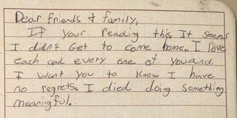 “Dear friends & family, If your reading this it seems I didn’t get to come home. I love each and every one of you and I want you to know I have no regrets. I died doing something meaningful.”
