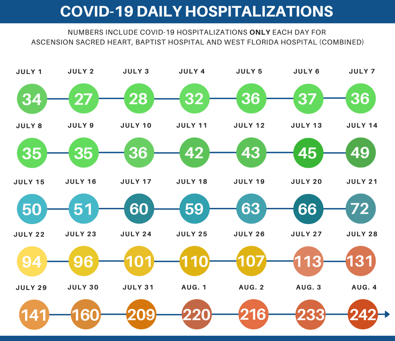 On July 28, there were 131 people hospitalized for COVID-19 in Ascension Sacred Heart, Baptist and West Florida hospitals. By Wednesday, August 4, that number was at 242. On July 4, there were only 32 hospitalizations.
