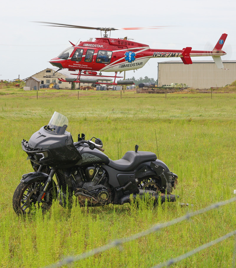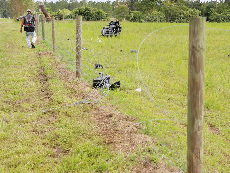 The adult male was northbound on Highway 97 just north of Pelt Road when he left the roadway and crash through a cattle fence. A witness said the motorcycle went through a fence before the man, and both traveled under an upper strand of barbed wire. Both came to rest in a pasture.