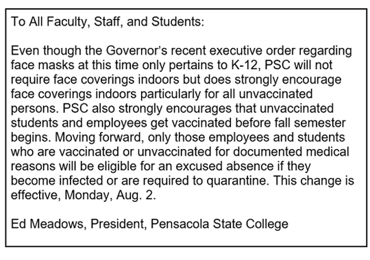Pensacola State College has rescinded a previously announced mask mandate that was set to begin Monday August 2, and the college has reversed course on not allowing excused abscesses related to COVID-19 for the unvaccinated.