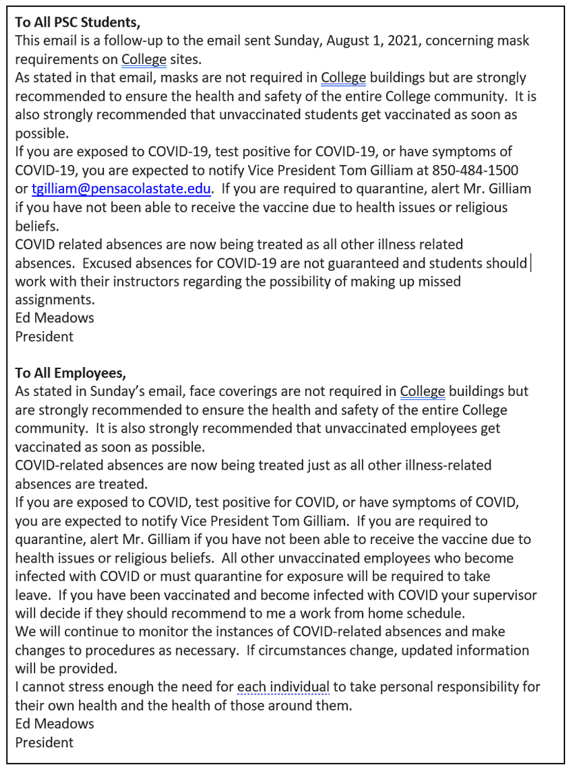 In an email to students on Sunday (pictured below), PSC President Ed Meadows rescinded that policy, announcing instead that mask are only recommended, especially for unvaccinated persons. He also announced that only those who are vaccinated or exempted for medical reasons will be excused for any absences due to COVID-19 infections or quarantines.