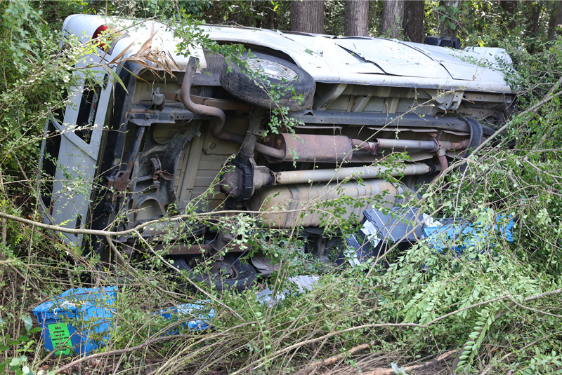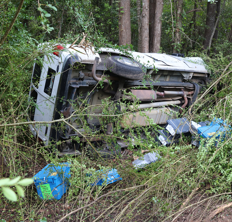 The van belonging to a pharmaceutical transport company and the passenger car collided about 9 a.m. at the intersection of East Highway 4 and Freedom Road. The car came to rest in a wooded area on the west side of Highway 4. The van overturned into a wooded area on the opposite side of the road, spilling much of its cargo.
