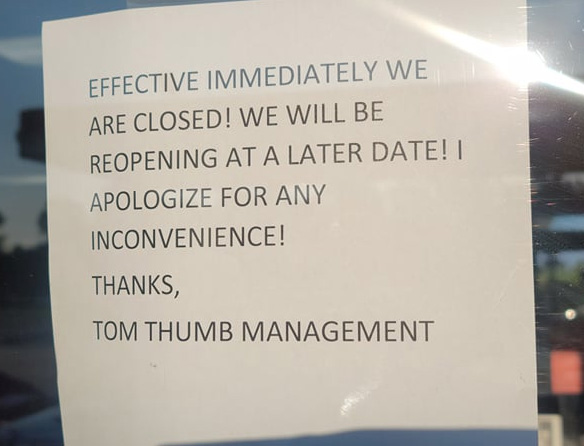 Customers were greeted with closure signs Thursday at the Molino Tom Thumb, and the store remained closed Friday. But company officials said the store is expected to reopen Saturday with limited weekend hours.
