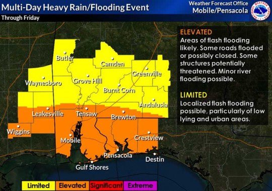 An elevated flooding risk will continue through Friday as heavy rain continues to move through the area. A flash flood watch is in effect.