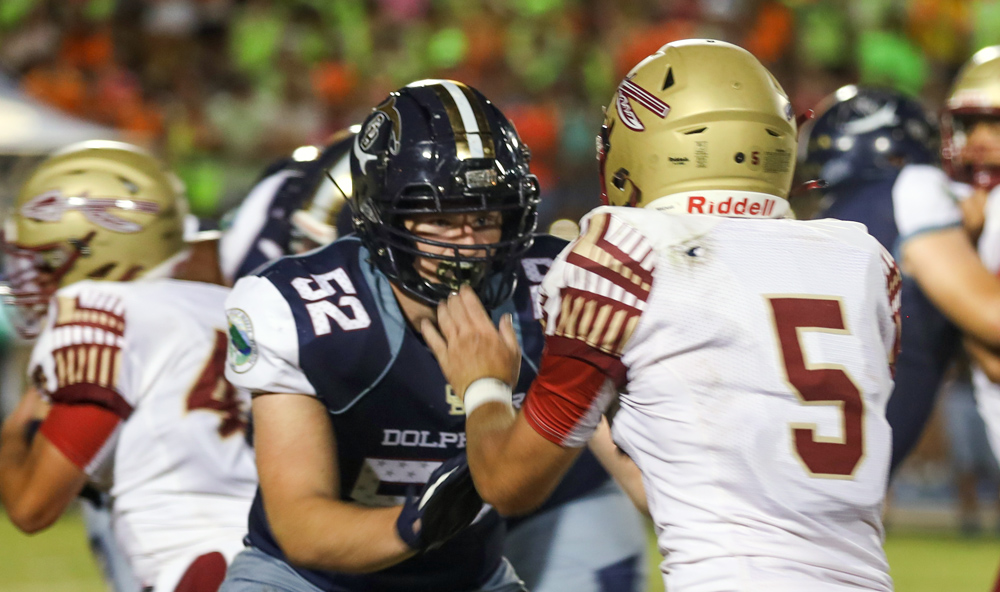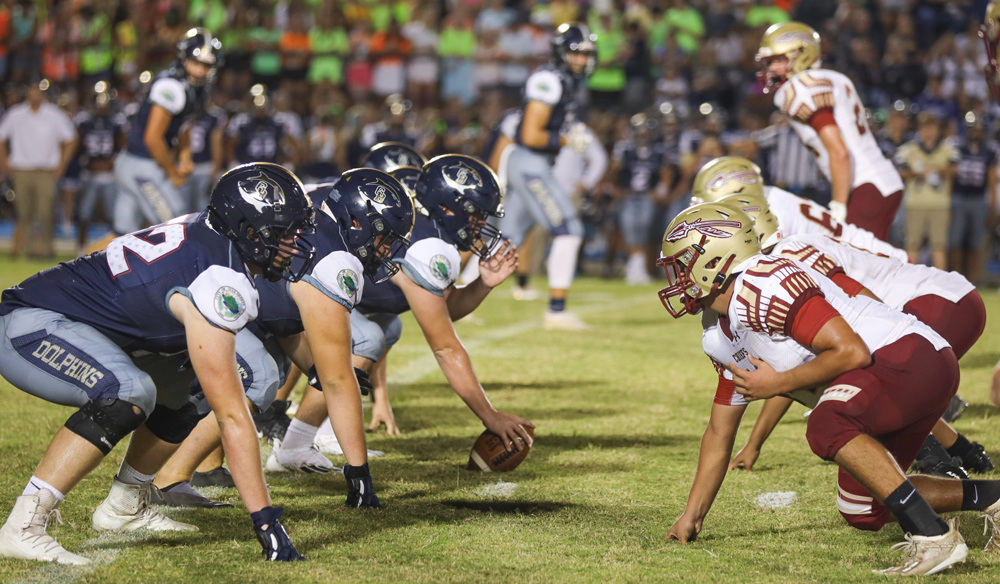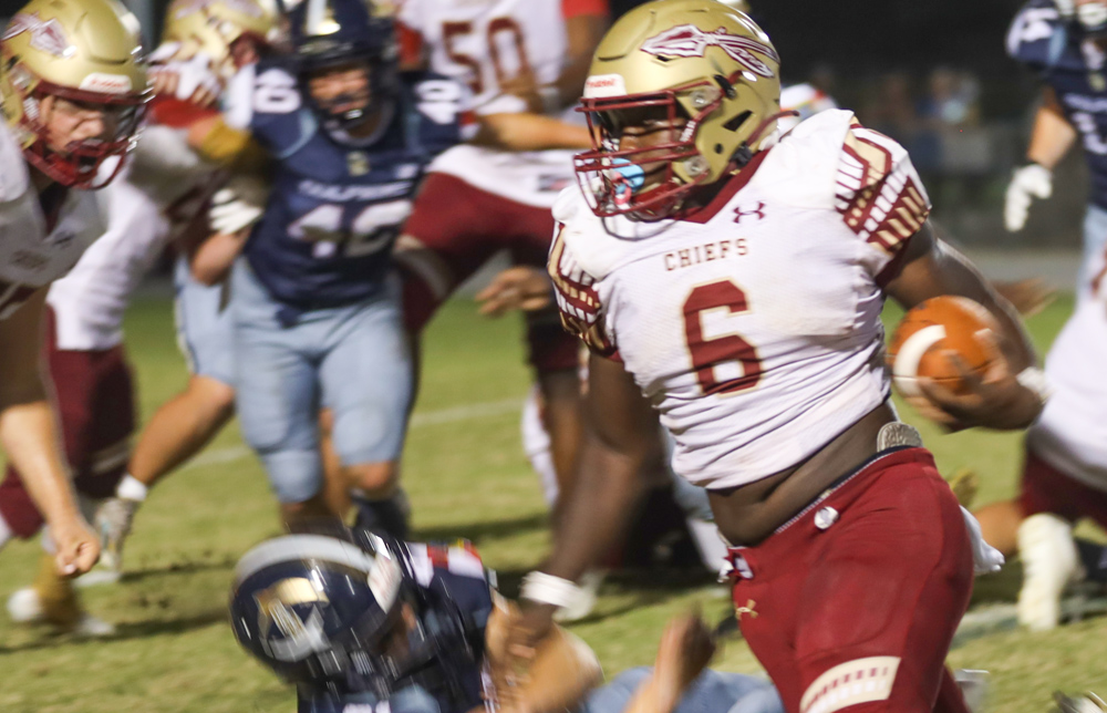 The 1A Chiefs took an early 3-0 lead over the 6A Dolphins, but the advantage did not last long. By halftime, Gulf Breeze was up 21-3.