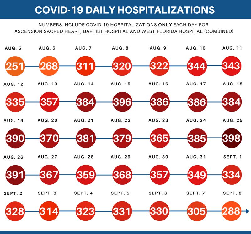 “The community should know that cases of COVID-19 remain high and the Delta variant of the virus is still widespread,” said Dawn Rudolph, president of Ascension Sacred Heart Pensacola. “We grieve for those who have passed from COVID-19 and we encourage you to help us stop COVID19 spread by wearing masks in public indoor spaces, social distancing, and, most important, getting the vaccine. Everyone in our community plays a critical role in keeping us safe from this virus.”