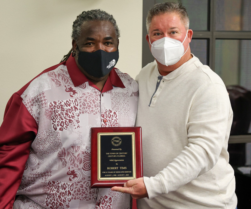 Pictured: Century Mayor Ben Boutwell (right) presents a service award to Robert Tims honoring him for 33 years of employment with the town. NorthEscambia.com photo, click to enlarge.