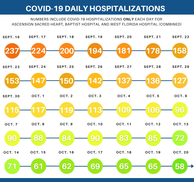 On October 20, there were 58 people hospitalized for COVID-19 in Ascension Sacred Heart, Baptist and West Florida hospitals. That compares to 181 one month ago.