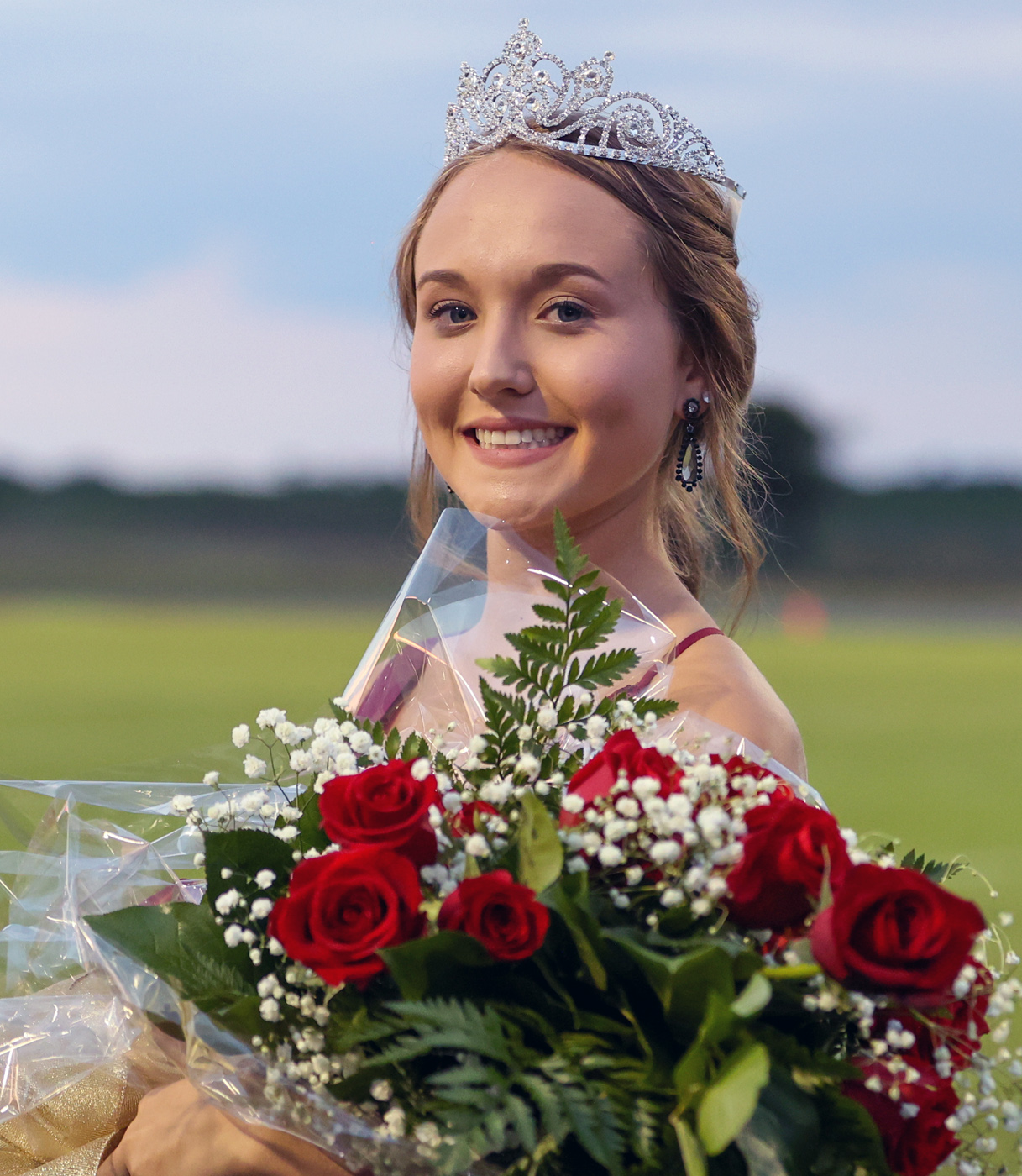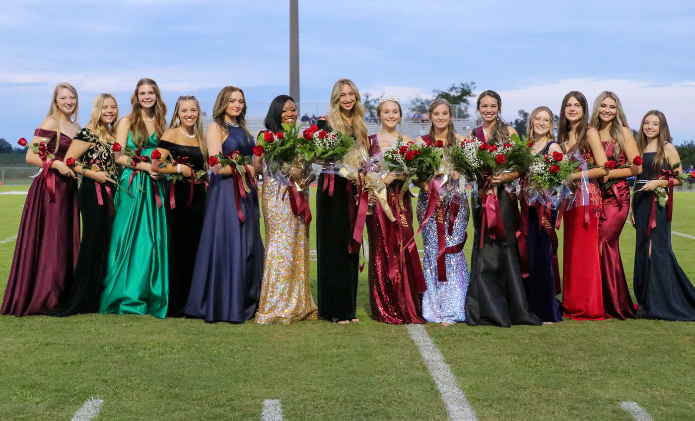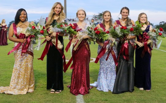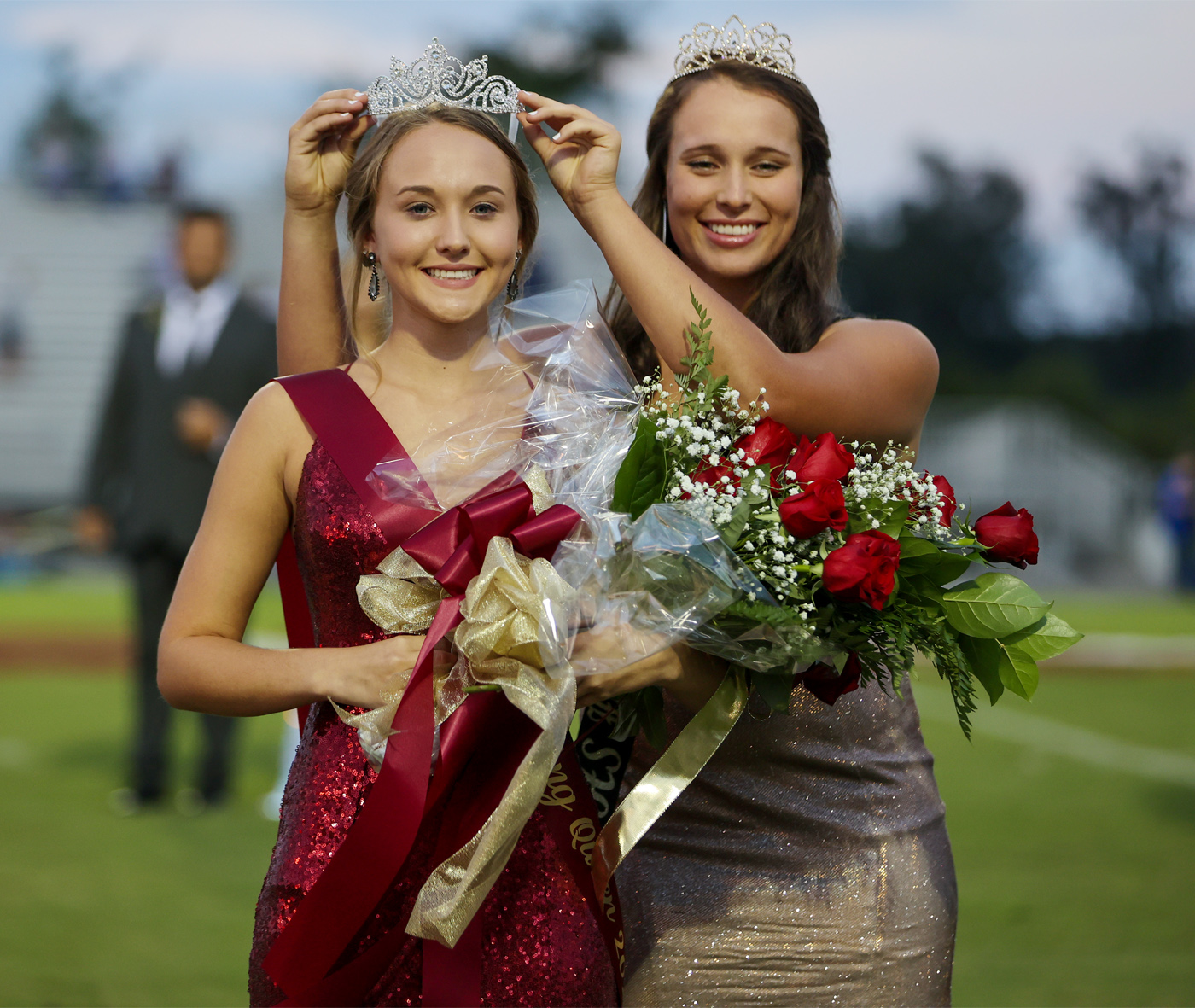 Pictured below are Sophomore Maid Ty’Deasia McKenzie, First Runner-up Anna Adams, Queen Nevaeh Brown, Second Runner-up Kaitlin Gafford, Junior Maid Emma Gilmore, and Freshman Maid Payton Daw. Pictured above is Queen Nevaeh Brown being crowned by 2020 Homecoming Queen Heather Knowles.