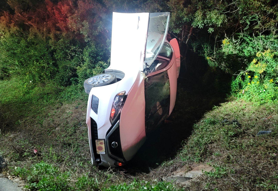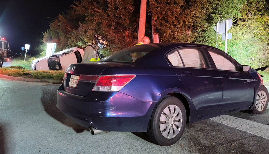 The crash happened about 8:20 p.m. between two passenger cars, one of which came overturned in a ditch.