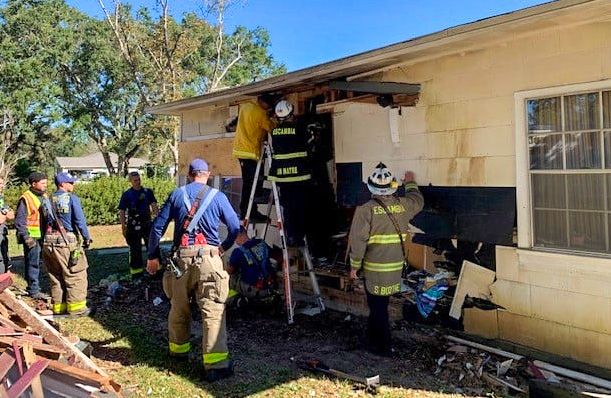 Escambia Fire Rescue worked to stabilize the home while boarding and tarping openings created by the vehicle.