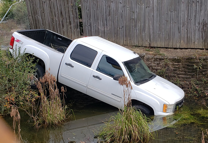 Luckily the truck stayed upright. Considering there is a ledge on the driver’s side, just one wheel on that ledge and it may have flipped the truck and the passengers cab would have been trapped under water. Thank goodness that did not happen. And thank goodness the water line was low.