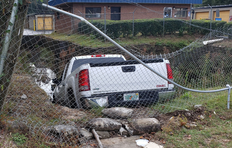 The driver was southbound on Guidy Lane when she went through the intersection with Nine Mile Road. Her GMC Sierra went through a fence and into the pond at a self-storage facility She was transported to the hospital by Escambia County EMS for evaluation.