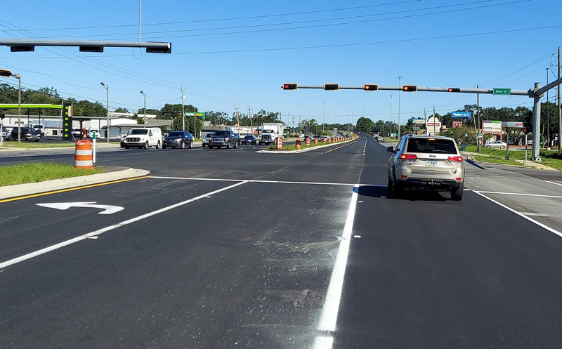 Pictured: The newly paved Highway 29 travel lanes near Hood Drive. Also seen in this photo are the medians, sidewalks, curb and gutter, and signalization upgrades. Photo for NorthEscambia.com, click to enlarge.