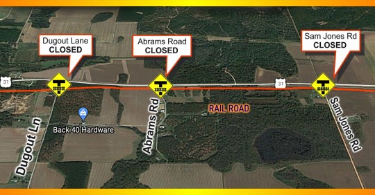 The crossings on Dugout Lane, Abrams Road and Sam Jones Road are closed just south of Highway 31, according to the Escambia County (AL) Sheriff’s Office. CSX reports that the crossings will be closed for the next one or two days.