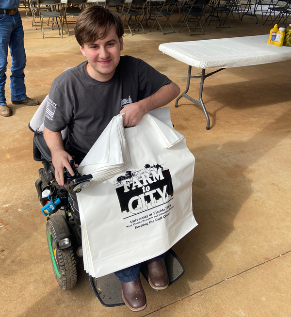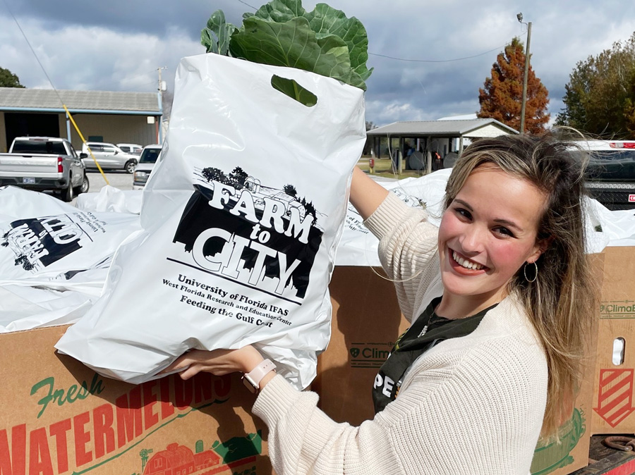 The event at the University of Florida’s West Florida Research and Education Center is part of Farm to City Week, bringing the bounty of the University of Florida Institute of Food and Agricultural Sciences farm to the needy of the city.