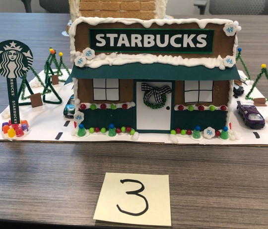 Second place with 138 votes in our informal just-for-fun contest was number 3….a gingerbread Starbucks with several extra shots of Christmas trees and gumdrops.