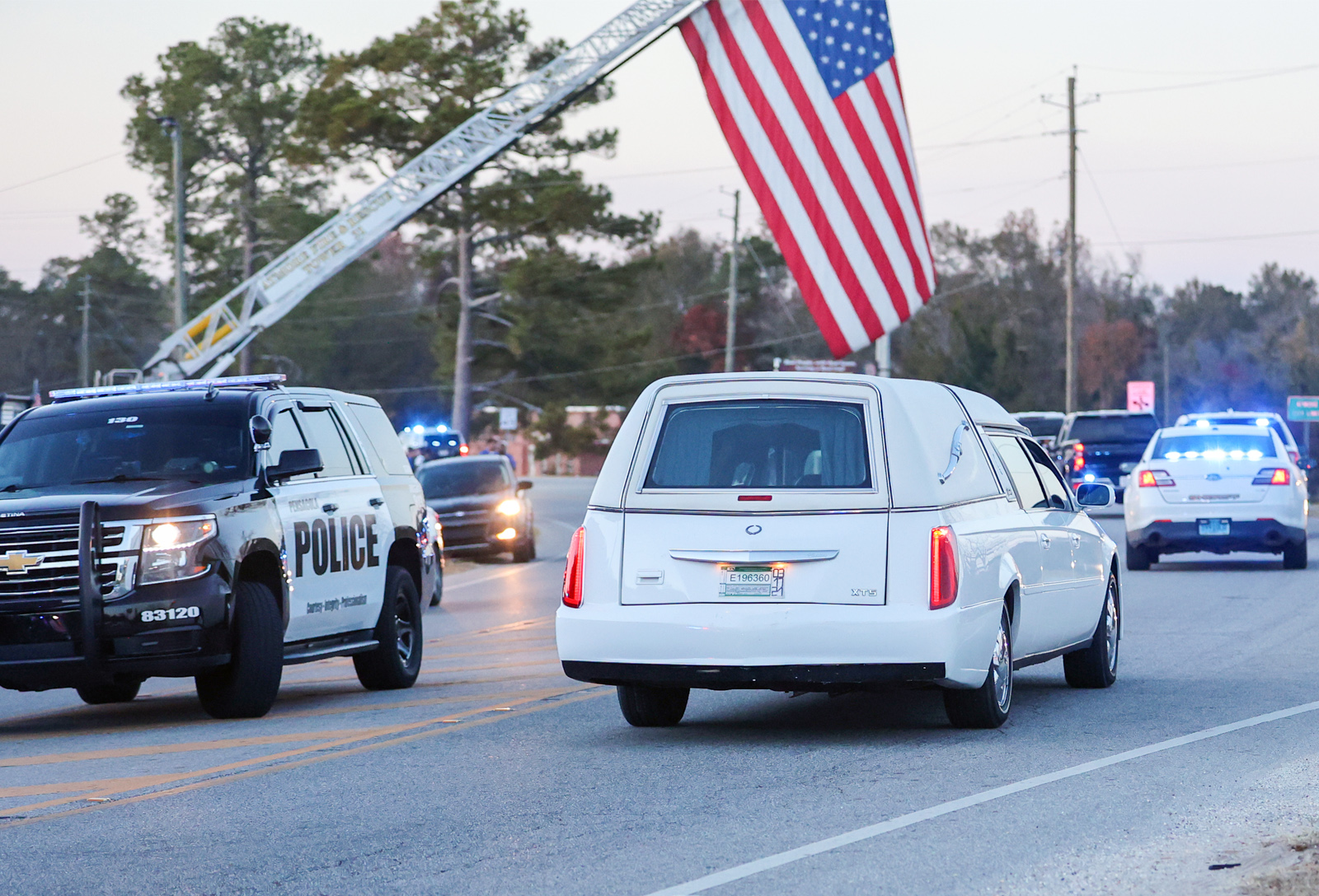 Thursday afternoon, Nicholson’s body was escorted north from Sacred Heart Hospital in Pensacola through Escambia County. After passing through North Escambia on Highway 97, the procession was met in Atmore by Alabama law enforcement. A giant American flag flew from an Atmore Fire Department truck just across the state line.