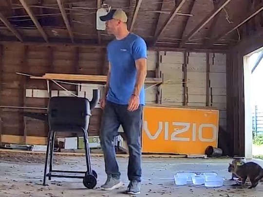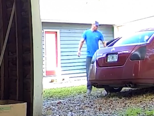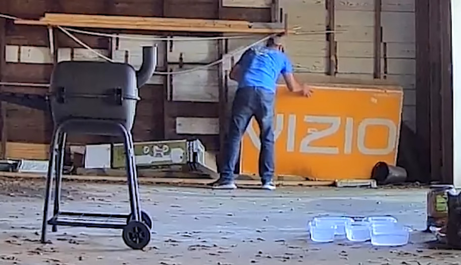 The suspect is seen in a surveillance video backing up a car to an open garage door, entering the structure and checking two large boxes, including a Vizio television box. Both boxes appear empty. The suspect then wanders around the mostly empty garage area.