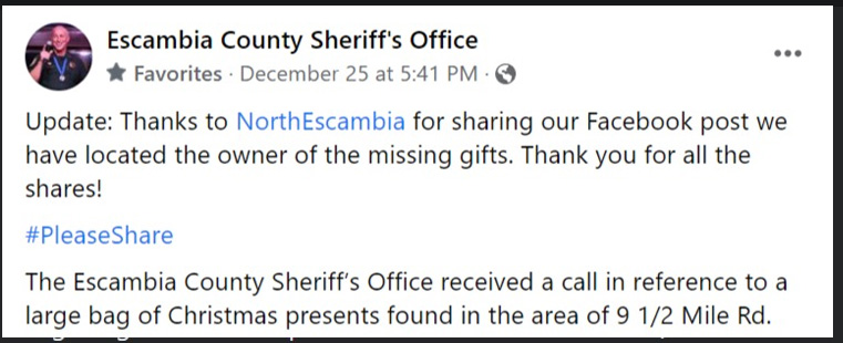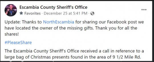The presents were found by not just any old Scrooge, but a special elf. No, a Christmas angel that turned in the gifts to the Escambia County Sheriff’s Office.
